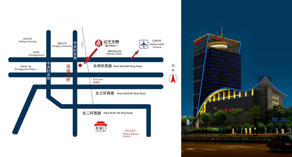 北京遼寧大廈位于北四環(huán)黃金地段,乘坐首都機場巴士即可到達(dá)。距譽有"中國硅谷"之稱的中關(guān)村信步可至,毗鄰北大清華,距中外聞名的奧運場館"鳥巢"僅5分鐘車程。地理位置得天獨厚,交通便捷。