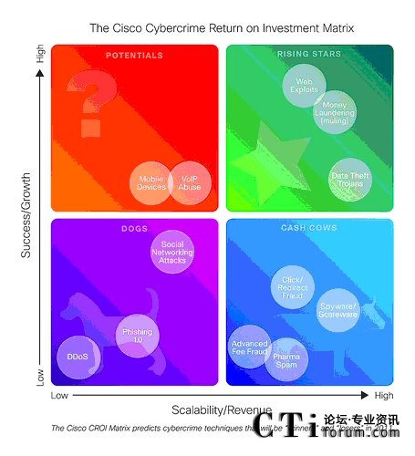 思科網(wǎng)絡(luò)犯罪投資回報(CROI)矩陣:在《思科2009年年網(wǎng)絡(luò)安全報告》中首次推出的思科CROI矩陣模型根據(jù)思科安全人士對尋求利益的犯罪者將使用的各種手段的預(yù)測,分析了2011年各種犯罪的類型。該矩陣根據(jù)2010年的表現(xiàn),預(yù)計如Zeus等竊取數(shù)據(jù)的木馬,易于部署的網(wǎng)絡(luò)釣魚,以及錢騾將會是2011年主要的犯罪形式!坝写疾臁钡馁嶅X工具包括手機惡意軟件—木馬如今已經(jīng)存在于SymbOS和Zitmo.Altr手機平臺中(Zitmo就是指手機中的Zeus)。另一方面,盡管社交網(wǎng)絡(luò)在去年《年度報告》潛在因素目錄中排名靠前,2011年它將不再是為網(wǎng)絡(luò)犯罪創(chuàng)造機會的重要途徑。不過這也并不意味著社交網(wǎng)絡(luò)詐騙將有所減少,它們僅僅是如Zeus木馬等惡意網(wǎng)站欺詐行為的一個小的環(huán)節(jié)。