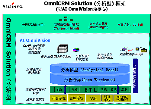 OmniCRM方案是亞信基于多年服務(wù)電信市場的豐富的行業(yè)經(jīng)驗,以及對國內(nèi)運營商業(yè)務(wù)發(fā)展的深刻認識而推出的,其中,AI OmniVision是OmniCRM方案中經(jīng)營分析型CRM 的核心產(chǎn)品。AI OmniVision不僅符合行業(yè)業(yè)務(wù)規(guī)范,而且基于對客戶行為、競爭環(huán)境,商業(yè)獲利率以及其他參數(shù)的透徹分析,能夠使運營商充分了解現(xiàn)有客戶、識別并關(guān)注贏利的客戶組、提高服務(wù)質(zhì)量、確?蛻魸M意度和忠誠度;同時吸引潛在的客戶;加強提供新服務(wù)的投資回報率;提高效率、減小成本,以實現(xiàn)業(yè)務(wù)價值的最大化。AI OmniVision采用數(shù)據(jù)倉庫、ETL、OLAP分析、靈活報表展現(xiàn)及數(shù)據(jù)挖掘等技術(shù),包含了用戶分析、業(yè)務(wù)分析、收益分析、大客戶分析、營銷分析、競爭分析、服務(wù)質(zhì)量、新業(yè)務(wù)分析等眾多功能模塊。