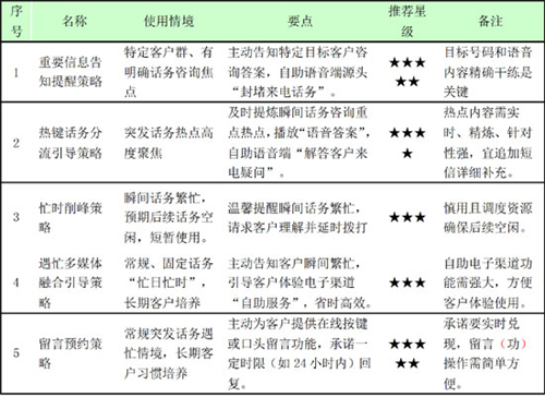 。1)策略內(nèi)容:突發(fā)話務(wù)往往導(dǎo)致瞬間話務(wù)高峰,如能將瞬間話務(wù)“均衡化”,則可有效避免“話務(wù)雪崩”,為此通過(guò)錄制IVR語(yǔ)音,引導(dǎo)客戶閑時(shí)再撥。【示例】“尊敬的客戶,目前人工話務(wù)繁忙,為節(jié)省您的時(shí)間,建議您4小時(shí)后再行撥打。給您帶來(lái)不便,我們深表歉意”。