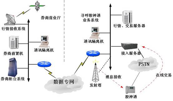 最終我們的設(shè)想是類似于呼叫中心的外包方式,由尋呼臺建立一套短訊接入系統(tǒng),并與券商的交易系統(tǒng)聯(lián)網(wǎng)(通過交易前置機),各券商租用部分資源,同時給他們的股民提供股神通話機,股民們一方面可通過尋呼臺的無線資源接收股市信息,另一方面可以通過電話線接入尋呼的交易系統(tǒng)進行交易。