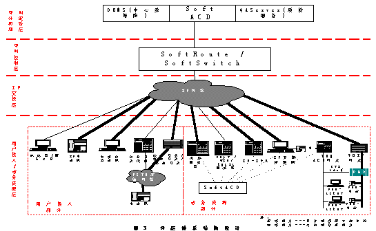 話務(wù)資源接入層―――所有的話務(wù)資源包括IP多媒體座席,IP-IVR(基于VOIP的IVR系統(tǒng)),聊天和WEB服務(wù)器,IP-IFR(基于VOIP的IFG系統(tǒng)),視頻服務(wù)器等,還包括通過(guò)VOIP網(wǎng)關(guān)和TDM
