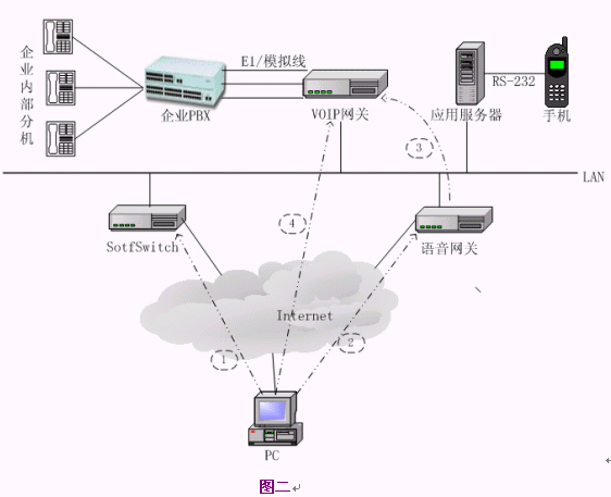 用戶使用系統(tǒng)時,需要先下載終端并安裝到PC上,然后在終端上撥企業(yè)內(nèi)部的分機號碼就可以了。對于一般的企業(yè),VoIP語音網(wǎng)關(guān)可以配置幾條模擬線到一個E1的規(guī)模,SoftSwitch、語音網(wǎng)關(guān)、應(yīng)用服務(wù)器可以安裝在一臺PC或PC服務(wù)器上,或者與企業(yè)的其它服務(wù)器(如代理服務(wù)器)合用,另外需要一到兩個公網(wǎng)IP地址資源。系統(tǒng)的硬件和網(wǎng)絡(luò)成本非常低,整個系統(tǒng)如果按一個E1(30路)容量計算,配置VoIP網(wǎng)關(guān)和一臺PC服務(wù)器,硬件價格不超過3萬元,如果VoIP網(wǎng)關(guān)支持隧道模式傳送信令和語音,則語音網(wǎng)關(guān)也可以省去。
