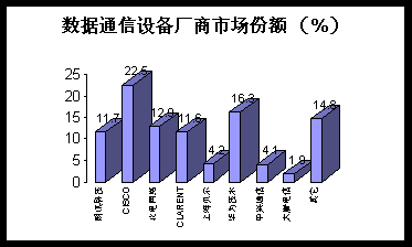 。1)市場(chǎng)規(guī)模: 年初各大運(yùn)營(yíng)商IP實(shí)驗(yàn)網(wǎng)的開(kāi)通以及聯(lián)通覆蓋300余城市的IP網(wǎng)絡(luò)大規(guī)模建設(shè),年中ChinaNet大提速與3期擴(kuò)容項(xiàng)目實(shí)施以及CNCnet開(kāi)通,年末CMnet骨干網(wǎng)一期工程上馬、2000年中國(guó)數(shù)據(jù)通信設(shè)備市場(chǎng)可謂是熱點(diǎn)頻仍。根據(jù)Frost&Sullivan分析,年內(nèi)網(wǎng)絡(luò)交換機(jī)、訪問(wèn)產(chǎn)品、 路由器、集線器等數(shù)據(jù)通信主要設(shè)備市場(chǎng)規(guī)模達(dá)到96億人民幣,同比增長(zhǎng)36%,數(shù)據(jù)通信設(shè)備市場(chǎng)再次進(jìn)入高速增長(zhǎng)期。