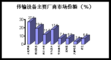 (3)市場(chǎng)發(fā)展及預(yù)測(cè):2001年城域網(wǎng)絡(luò)、接入網(wǎng)絡(luò)等光網(wǎng)絡(luò)建設(shè)的加速,將推動(dòng)傳輸設(shè)備市場(chǎng)保持25%以上的增長(zhǎng)。 更多的非外資廠商預(yù)計(jì)在高端傳輸設(shè)備領(lǐng)域取得突破,相關(guān)設(shè)備價(jià)格可能同比降低12%以上。傳統(tǒng)傳輸設(shè)備市場(chǎng)加速萎縮、DWDM等光傳輸技術(shù)與設(shè)備將成為市場(chǎng)中的壟斷力量。
