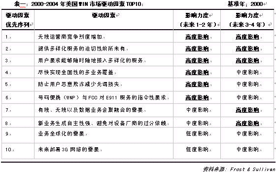 根據Frost & Sullivan 分析預測,2000-2004年美國WIN設備市場呈現相對均衡的發(fā)展趨勢,其TOP10的影響因素與影響力度見下表: