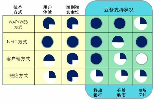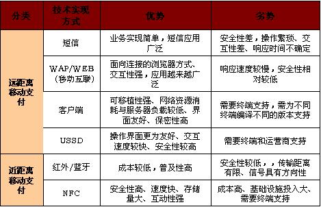 移動(dòng)支付(Mobile payment)包括遠(yuǎn)距離方式和近距離方式。遠(yuǎn)距離移動(dòng)支付的主要技術(shù)實(shí)現(xiàn)方式有SMS、WAP、客戶端(手機(jī)軟件)和USSD;近距離移動(dòng)支付的主要技術(shù)實(shí)現(xiàn)方式有紅外和NFC。各種移動(dòng)支付業(yè)務(wù)技術(shù)實(shí)現(xiàn)方式優(yōu)劣勢比較詳見圖表1。