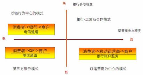 從產(chǎn)業(yè)鏈環(huán)節(jié)上看,移動(dòng)支付的主要參與者主要包括:消費(fèi)者、平臺(tái)提供商、銀行、運(yùn)營商和商戶。其中,銀行和運(yùn)營商在其中具有較高的談判能力。因此,可以按照這兩者在產(chǎn)業(yè)鏈中的參與程度,劃分移動(dòng)支付的商業(yè)模式。總的來說,銀行機(jī)構(gòu)管理著廣大用戶的資金帳戶,擁有完善的支付體系,在支付領(lǐng)域具有天然的用戶信任。運(yùn)營商則擁有完備的網(wǎng)絡(luò)設(shè)施和先進(jìn)的IT系統(tǒng),通過定制終端,運(yùn)營商可以將各種先進(jìn)的移動(dòng)應(yīng)用提供給用戶,使用戶獲得良好的移動(dòng)化生活體驗(yàn)。因此,運(yùn)營商在這方面具有較好的用戶資源和營銷渠道。
