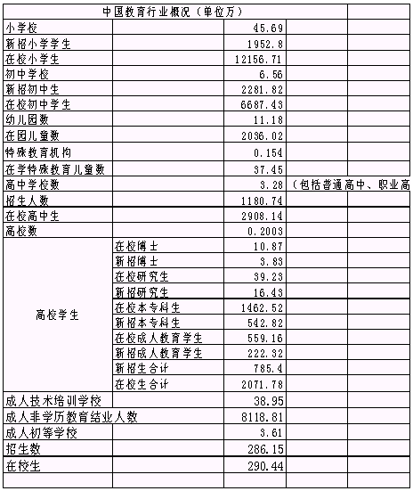 按照教育部2002年發(fā)布的《2002年全國教育事業(yè)發(fā)展統(tǒng)計公報》,教育部將整個社會的教育各個環(huán)節(jié)分為以下幾個部分: