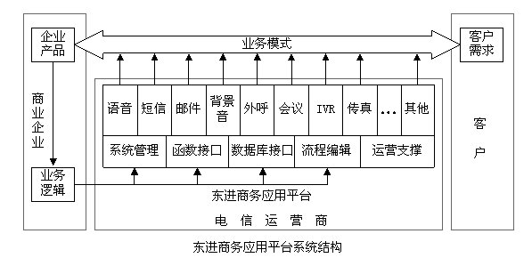 從應(yīng)用角度看,東進(jìn)商務(wù)應(yīng)用平臺將業(yè)務(wù)分為3個部分--企業(yè)端的業(yè)務(wù)邏輯、電信運營商端的業(yè)務(wù)實現(xiàn)和客戶端業(yè)務(wù)響應(yīng)。企業(yè)根據(jù)其產(chǎn)品特點,制定相應(yīng)的業(yè)務(wù)邏輯,去控制電信運營商的商務(wù)應(yīng)用平臺,平臺在業(yè)務(wù)邏輯的控制下,去響應(yīng)客戶端的業(yè)務(wù)需求,由此組成一個智能化的業(yè)務(wù)模式。