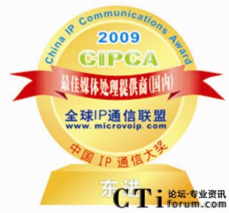 代表國內(nèi)IP通信領(lǐng)域最高水準(zhǔn)的中國IP通信大獎(CIPCA),于2009年9月25日在上海NexCom Expo 下一代網(wǎng)絡(luò)通信展暨CIPCC中國IP通信大會上揭曉。深圳市東進(jìn)技術(shù)繼2008年獲得此項殊榮后,憑借無可爭議的票數(shù)優(yōu)勢,蟬聯(lián)“2009中國IP通信大獎”,取得“最佳媒體處理提供商(國內(nèi))”獎項。