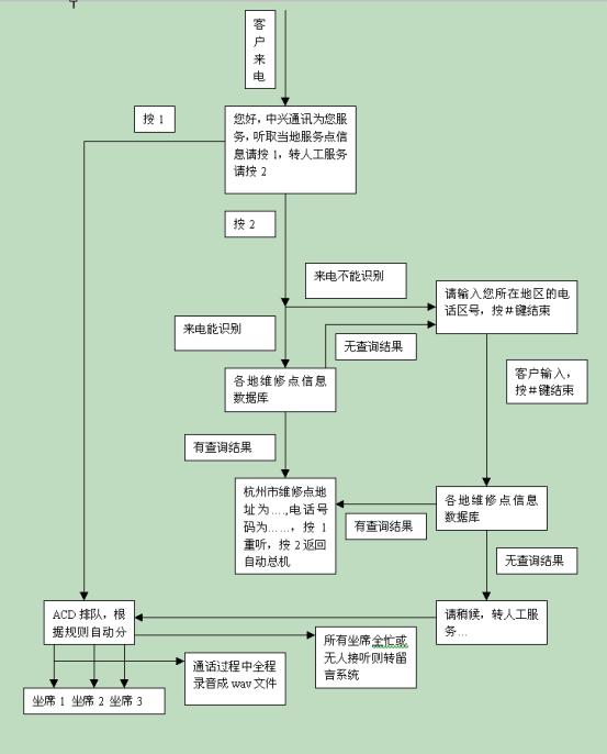 在中興通訊呼叫中心流程設(shè)計(jì)上充分體現(xiàn)了CTI技術(shù)以及數(shù)據(jù)庫(kù)技術(shù)等IT技術(shù)與星際先進(jìn)的管理理念的融合。該流程的設(shè)計(jì)保證將主動(dòng)提高服務(wù)品質(zhì)的工作集中于對(duì)呼叫者最重要的環(huán)節(jié)――對(duì)維修網(wǎng)點(diǎn)信息的咨詢上。它為所有呼叫者提供了詳細(xì)、精煉、基本的高品質(zhì)電話服務(wù),同時(shí)又根據(jù)電話區(qū)號(hào)提供了有針對(duì)性的咨詢服務(wù)。