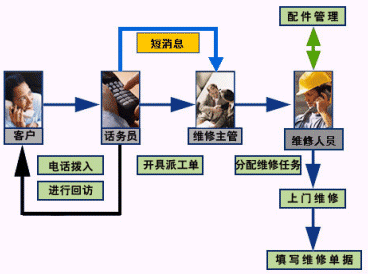 后臺(tái)客服應(yīng)用子系統(tǒng)建成后,客戶的投訴被自動(dòng)導(dǎo)入,生成投訴單和維修單,自動(dòng)轉(zhuǎn)發(fā)給維修部,安裝部等專業(yè)部門進(jìn)行處理,處理完后,系統(tǒng)會(huì)安排話務(wù)員進(jìn)行回訪,消費(fèi)者的處理意見和滿意度將被忠實(shí)地記錄下來,進(jìn)一步充實(shí)到客服數(shù)據(jù)庫中以指導(dǎo)企業(yè)的生產(chǎn)研發(fā)。