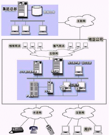 各地區(qū)系統(tǒng)通過(guò)互聯(lián)網(wǎng)和下屬維修網(wǎng)點(diǎn)、銷售網(wǎng)點(diǎn)相連,構(gòu)成一個(gè)地區(qū)性服務(wù)網(wǎng)絡(luò)。各地區(qū)系統(tǒng)通過(guò)互聯(lián)網(wǎng)和集團(tuán)總部連接,構(gòu)成信息收集網(wǎng)絡(luò)。前者支持業(yè)務(wù)服務(wù),后者支持管理決策,共同構(gòu)成綜合公用事業(yè)服務(wù)平臺(tái)。