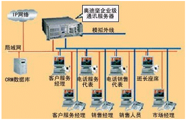 * 小型呼叫中心:座席數(shù)目在50個以下。投資一般在50萬元以下。這種系統(tǒng)結(jié)構(gòu)與第二種類似,但使用較小型PBX,或用板卡代替,業(yè)務代表座席、應用服務器及數(shù)據(jù)庫大小在量上均作相應減少,它主要適合中小型企業(yè)的業(yè)務需要。