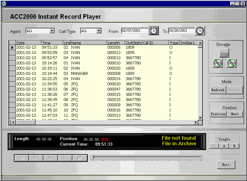 管理員可以通過MMPlayer對錄制的語音進(jìn)行回放,系統(tǒng)提供完善的檢索功能,可以根據(jù)來電時(shí)間、來電號碼、呼入/呼出以及座席等條件靈活地進(jìn)行查詢,很容易地找回所儲存的每個(gè)座席各種事件的詳細(xì)信息,并可以轉(zhuǎn)換成通用的.WAV格式文件在任何PC上進(jìn)行播放,或者通過局域網(wǎng)絡(luò)或互聯(lián)網(wǎng)進(jìn)行分發(fā)。
