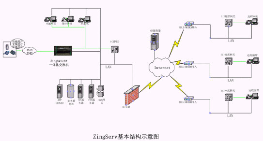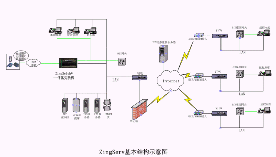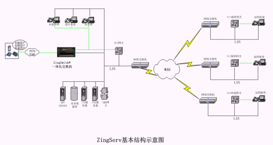 硬件:坐席集中的中心點都有ZingSwitch®交換機(jī),S口網(wǎng)關(guān)和CO8卡或E1接口網(wǎng)關(guān)和E1卡。VPN動態(tài)注冊服務(wù)器和VPN設(shè)備,或GK服務(wù)器。