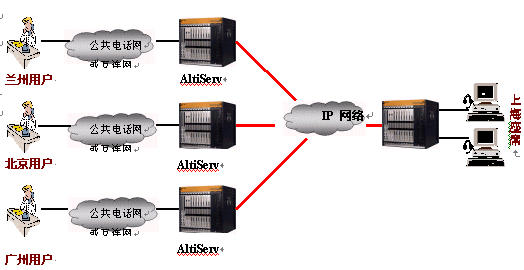 奧迪堅(jiān)分布式呼叫中心方案可以分為多對(duì)多(圖1)和多對(duì)一(圖2)兩種形式,但都能夠?yàn)橛脩籼峁┍镜睾艚,異地服?wù)的功能。各個(gè)服務(wù)點(diǎn)之間是對(duì)等關(guān)系或隸屬關(guān)系,它們分布于不同的地理位置,在運(yùn)作時(shí)間、資源、功能上互相協(xié)作,為用戶提供最大限度的服務(wù)。如果基于奧迪堅(jiān)通訊系統(tǒng)的分布式呼叫中心,用戶在北京,廣州或蘭州的任何一個(gè)地方撥打本地的服務(wù)電話,都可以通過(guò)IP網(wǎng)絡(luò),自動(dòng)路由到上海的坐席,由上海的坐席來(lái)為用戶提供統(tǒng)一的服務(wù),此謂多對(duì)一模式。如果北京、上海或廣州的用戶撥打本地電話后,系統(tǒng)經(jīng)過(guò)網(wǎng)絡(luò)排隊(duì)和自動(dòng)路由,被分配到三個(gè)城市中任意一個(gè)正在空閑的或正適合此項(xiàng)服務(wù)的坐席,此謂多對(duì)多。