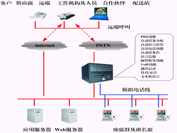 現(xiàn)代物流企業(yè)與以往的物流企業(yè)不同,不僅僅局限于物流中的某一個環(huán)節(jié),而是普遍采用了信息化管理技術(shù),如ERP、物流管理(LM)、SCM等應(yīng)用系統(tǒng),并通過Internet將遍布在各地的物流中心與客戶連接起來,形成一個高效率的物流配送網(wǎng)絡(luò)。建立在奧迪堅基于IP的分布式呼叫中心平臺上的客戶服務(wù)系統(tǒng),以IP技術(shù)為核心在網(wǎng)絡(luò)上構(gòu)建一個語音和數(shù)據(jù)的統(tǒng)一平臺,在一臺服務(wù)器上融合了CTI、PBX、ACD、VoIP、Voice、Mail,Recording,Call Routing等技術(shù)和應(yīng)用,實現(xiàn)網(wǎng)絡(luò)時代高效通訊所需所有常用功能。同時憑借其高度的靈活性和柔韌性,可以無縫地嵌入物流配送網(wǎng)絡(luò)的各個環(huán)節(jié),成為真正滿足現(xiàn)代物流企業(yè)需要的綜合性服務(wù)和營運中心,無論在世界的哪個角落,遠程IP座席和分布的異地機構(gòu)都可以共享所有資源(語音、數(shù)據(jù)、座席),真正實現(xiàn)一個高效的、信息共享的分布式呼叫中心系統(tǒng)。