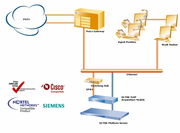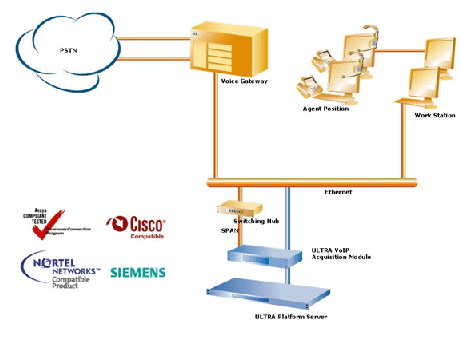 ULTRA平臺的VoIP錄音方案可真正實現純軟件解決方案,可由客戶自行配置符合要求的錄音服務器,安裝ULTRA平臺的軟件即可。另外,對于不能提供具備SPAN功能的網絡使用環(huán)境,ULTRA平臺也可提供相應的模塊產品(ULTRA