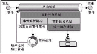 在路由管道中流轉(zhuǎn)著加載了業(yè)務(wù)的工作流事件。事件按照事先定義的路由規(guī)則流轉(zhuǎn),事件的路由規(guī)則定義了事件在路由管道中可以?康摹罢九_”,同時(shí)定義了事件到達(dá)“站臺”時(shí)可以領(lǐng)取并處理加載在事件上的業(yè)務(wù)的角色。事件從始發(fā)站臺進(jìn)入路由管道,經(jīng)過一個(gè)或多個(gè)中間站臺,最后到達(dá)終點(diǎn)站。事件每?恳粋(gè)站臺,相關(guān)人員領(lǐng)取事務(wù),并進(jìn)行處理后重新裝載事務(wù),觸發(fā)事件向下一個(gè)站臺流轉(zhuǎn),除非事件已經(jīng)到達(dá)終點(diǎn)站。