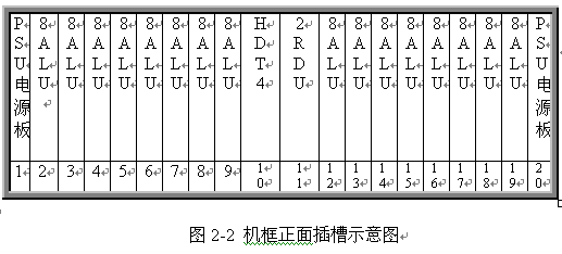 見圖 2 和 3 ,遠端模塊采用 19 英寸標(biāo)準(zhǔn)機框,高度為 5U ,可安裝在各種標(biāo)準(zhǔn)的 19 英寸的機柜中。機框共 20 個插槽,正面插板,反面背板出線。每個機框可插 20 塊各種類型的板件,其中兩邊第 1 第 20 槽固定插電源板 PSU ,中間第 10 號槽固定插數(shù)字中繼接口板 HDT4 ,其余 16 個槽為通用槽口,可插 16 塊各種類型接口板。每塊板為 8 路,一個機框總共 128 話路。調(diào)度接口板 2RDU 固定插第 11 槽,該板不占機框端口。對于自帶交換系統(tǒng),需要安裝一塊系統(tǒng)信號音板 8TDU ,該板固定插 19 槽,占 8 個端口。