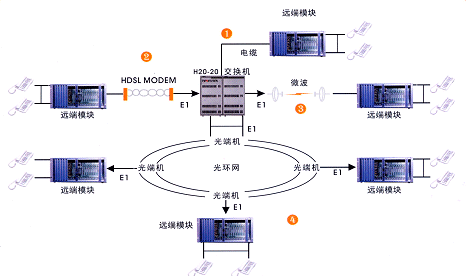 遠端模塊通過標(biāo)準(zhǔn) 2M ( E1 )接口與交換機連接。該接口不受傳輸距離和傳輸設(shè)備的限制。常用的傳輸設(shè)備有 SDH 、 PDH 光端機(光纜),數(shù)字微波、數(shù)字?jǐn)U頻, HDSL 調(diào)制解調(diào)器(雙絞線)等。
