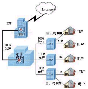 寬帶小區(qū)網(wǎng)絡(luò)建設(shè)采用基于三層交換的千兆以太技術(shù),在小區(qū)核心引入帶光口的千兆以太網(wǎng)交換機(jī),通過光纖以千兆速率上連至ISP接入?yún)^(qū)域交換機(jī)。小區(qū)內(nèi)部形成星型結(jié)構(gòu),每棟單元樓內(nèi)放置帶百兆光口的以太網(wǎng)交換機(jī),通過百兆光纖將小區(qū)核心和單元樓連接起來。樓宇內(nèi)部布放五類線,連至用戶計算機(jī)的網(wǎng)卡,使最終用戶上網(wǎng)速率達(dá)到10M或更高。