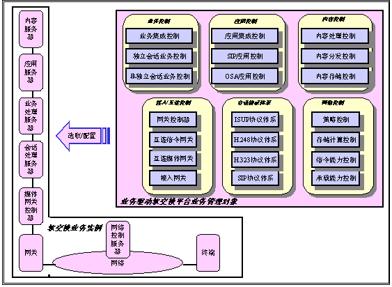 我們已經看到,軟交換技術支持的電信業(yè)務能力一直在不斷發(fā)展,開發(fā)新的電信業(yè)務已經成為電信運營商市場競爭的重要條件。事實上,業(yè)務能力是電信運營商或是電信用戶關心的基本問題,而不是實現這種業(yè)務的具體的技術和體系結構。選擇何種技術和結構,則是電信運營商依據自有的資源做出的選擇。因此,業(yè)務驅動的軟交換平臺需要根據實際的情況選取合適的技術和結構實現所需的業(yè)務。我們把實現電信業(yè)務中涉及的要素稱為業(yè)務管理對象。軟交換平臺涉及到以下的六類業(yè)務管理對象:會話協議體系、接入/互連控制、業(yè)務控制、應用控制、內容控制和網絡控制。會話協議體系是任何電信業(yè)務的基礎。對接入、互聯、業(yè)務、應用和內容的控制也是建立電信業(yè)務所必需的。網絡控制涉及到一個新業(yè)務和網絡全局的關系。除了平臺管理業(yè)務之外,每個業(yè)務管理對象均包含一個可選擇/可設計的集合,供業(yè)務設計時使用。所有這些業(yè)務管理對象的集合,構成了業(yè)務驅動軟交換平臺的控制功能的整體。下圖給除了業(yè)務驅動軟交換平臺上的業(yè)務管理對象,以及從這些業(yè)務管理對象映射的軟交換系統(tǒng)實例。
