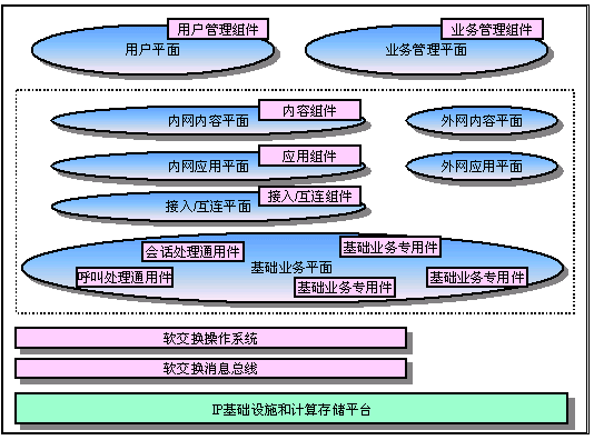 從結構上看,業(yè)務驅動的軟交換平臺是一個復雜的多域多層組件平臺。一個電信業(yè)務的實現是對平臺上的組件的組裝過程。業(yè)務驅動的軟交換平臺上的組件分為用戶平面、基礎業(yè)務平面、接入/互連/移動控制平面、應用平面、內容平面和業(yè)務管理平面。用戶平面的組件負責維護用戶的注冊信息、位置信息、狀態(tài)信息、業(yè)務信息和業(yè)務使用信息。基礎業(yè)務平面的組件分為三大類型:電路基礎業(yè)務、包交換基礎業(yè)務和多媒體交換基礎業(yè)務。每個基礎業(yè)務分成傳輸層、承載層、媒體層、呼叫處理層和業(yè)務層,其中的控制包括了對各層功能的控制協議和層間交互的控制協議。接入/互連/移動控制平面中包含了對各種接入網絡的控制、對互聯網絡的控制和對移動性的控制協議,也分成傳輸層、承載層、媒體層、呼叫處理層和業(yè)務層的控制組件。應用平面的組件分為三種類型,基于傳統(tǒng)智能網(IN,