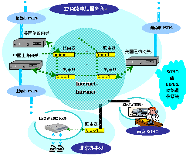 目前,在全球各地蓬勃發(fā)展起一項(xiàng)新興行業(yè)——IP網(wǎng)絡(luò)電話服務(wù)商,他們利用遍布全球、資源豐富的Internet / Intranet網(wǎng)絡(luò),組織自己的IP電話核心網(wǎng)絡(luò),將該網(wǎng)絡(luò)的服務(wù)開放給各地的公眾。其核心網(wǎng)絡(luò)的網(wǎng)關(guān)完全遵照ITU-T H.323標(biāo)準(zhǔn),可以解決電話號(hào)碼與IP地址的映射,IP地址解析,路由尋路等問題。能夠?qū)崿F(xiàn)SOHO族通過該網(wǎng)絡(luò)接入全球各地的市話。