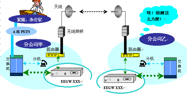 現(xiàn)今的計(jì)算機(jī)網(wǎng)絡(luò)建設(shè)中,多以DDN為主的局域網(wǎng)互連,往往由于DDN線路不能到達(dá)或要求專用內(nèi)部通道等原因,建設(shè)以無線為室外主要網(wǎng)絡(luò)通道的數(shù)據(jù)通信平臺(tái),配合IP語音網(wǎng)關(guān)形成內(nèi)部的語音通信系統(tǒng),不僅建設(shè)簡單(無須各種市政管理部門的批復(fù)),并且造價(jià)較低,快速有效地解決數(shù)據(jù)互連及建立專用安全保密的內(nèi)部語音系統(tǒng)。
