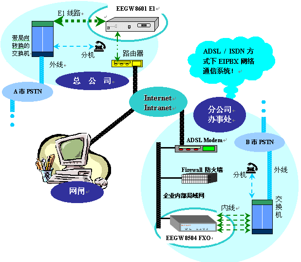 為實(shí)現(xiàn)地理位置分散的各企業(yè)分支機(jī)構(gòu)間的語音通信,節(jié)約企業(yè)內(nèi)部的通信成本和管理成本,許多公司在選擇ADSL或ISDN等其他寬帶接入技術(shù)接入Internet,同時(shí)希望利用該網(wǎng)絡(luò)建立內(nèi)部的EIPBX網(wǎng)絡(luò)通信系統(tǒng)。