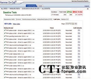 只需使用一個簡單易用的Web接入就可以和Empirix測試小組一起實時跟蹤測試進(jìn)度。此外,還同時可以查看測試結(jié)果、發(fā)生失敗的類型和導(dǎo)致失敗發(fā)生的測試流量。通話全程記錄功能可以用來記錄相關(guān)通話,從而捕獲和幫助診斷發(fā)生失敗的根源?梢詤⒖枷铝袌D表: