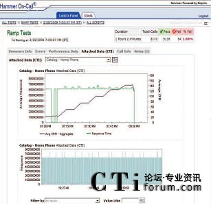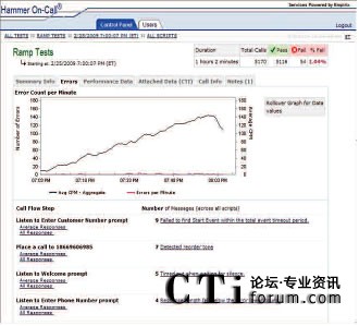 Hammer On-Call IVR測試使用各種各樣的主叫場景模擬真實世界用戶交互。通過改變呼叫量和呼叫場景的混合,Empirix測試專家可以生成指向IVR的模擬真實世界的呼叫流量。此外,在測試中,不同的呼叫測試點(diǎn)上可以使用不同的呼叫率。在測試過程中經(jīng)常會用到三種基本呼叫模型及其變體。基本測試是使用一個恒定的低呼叫率檢驗被測環(huán)境是否已準(zhǔn)備好接受呼叫;增量測試是使用一個固定增量穩(wěn)步增加呼叫量一直到達(dá)峰值呼叫量,然后,增加呼叫量直至超過期望值,檢驗系統(tǒng)在峰值時段內(nèi)是否有額外容量;最后,‘浸透’測試是在指定的時段內(nèi)使用一個恒定的高呼叫率檢驗系統(tǒng)穩(wěn)定性。