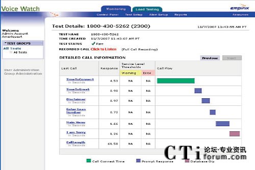 電話交易監(jiān)測: 一個電話交易由一條指定的路由組成,呼叫者穿越這條路由,通過按鍵或語音完成一項自助服務(wù)的交易。對于每一個通話路由,Voice Watch被設(shè)計成通過撥號或者語音指定這條路由完成一項IVR自助服務(wù)的交易,例如賬戶余額檢查,賬單支付等。電話交易監(jiān)測管理自助服務(wù)的可用性和性能,也測量承載網(wǎng)的性能和交換機(jī)、IVR、語音識別和主機(jī)/數(shù)據(jù)庫的響應(yīng)時間。