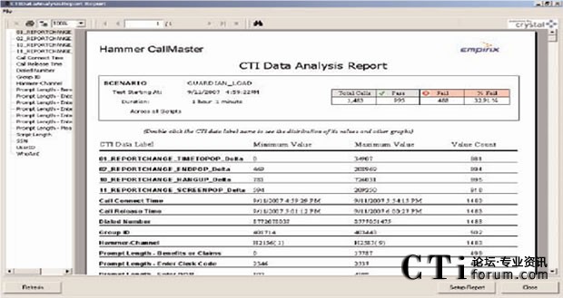 如果響應(yīng)時(shí)間超過設(shè)定的預(yù)置值(閥值),或者發(fā)現(xiàn)任何其它問題時(shí),Hammer可以把這個(gè)錯(cuò)誤和它的位置記錄在數(shù)據(jù)庫中,然后實(shí)時(shí)顯示測試結(jié)果。Hammer可以模擬呼叫流程中的任何一個(gè)方面,包括DTMF按鍵音可變信息的記錄或者是為測試支持語音識(shí)別系統(tǒng)而播放大量的語音文件。Hammer專利的語音提示識(shí)別能力更可以自動(dòng)檢驗(yàn)在IVR和ACD/PBX系統(tǒng)中是否正確播放語音提示。