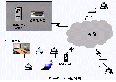 如下圖所示,ViewOffice由會議室型終端ViewPower,客戶端軟件ViewPhone,客戶端即時消息軟件ViewIM,多點控制服務(wù)器ViewExchange