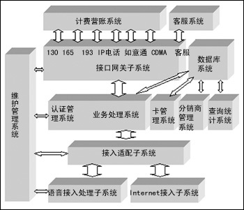 綜合付費(fèi)平臺(tái)的軟件邏輯結(jié)構(gòu)分為語(yǔ)音接入處理子系統(tǒng)、Internet 接入子系統(tǒng)、接入適配網(wǎng)關(guān)子系統(tǒng)、認(rèn)證管理子系統(tǒng)、業(yè)務(wù)處理系統(tǒng)、卡管理系統(tǒng)、分銷(xiāo)商管理系統(tǒng)、查詢統(tǒng)計(jì)系統(tǒng)、數(shù)據(jù)庫(kù)系統(tǒng)、接口網(wǎng)關(guān)子系統(tǒng)和維護(hù)管理子系統(tǒng)。