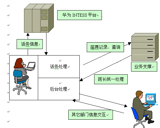 該系統(tǒng)在鐵通CRIS 平臺(tái)上運(yùn)行,前端接入采用華為CC08-A型排隊(duì)機(jī),華為INTESS平臺(tái),集成正邦高科座席軟件。完成企業(yè)業(yè)務(wù)咨詢、投訴建議的受理、產(chǎn)品訂購(gòu)、外呼調(diào)查等業(yè)務(wù),并針對(duì)各業(yè)務(wù)的特色規(guī)劃了企業(yè)的業(yè)務(wù)流程。正邦高科客戶服務(wù)系統(tǒng)的坐席軟件,和華為INTESS采用緊耦合方式將話務(wù)信息和業(yè)務(wù)信息結(jié)合在一起,便于統(tǒng)計(jì)分析,制訂客戶服務(wù)中心的運(yùn)營(yíng)策略。在后臺(tái)業(yè)務(wù)管理系統(tǒng)中,客戶服務(wù)系統(tǒng)設(shè)計(jì)了便于分析業(yè)務(wù)的一系列統(tǒng)計(jì)報(bào)表,使企業(yè)可以方便地對(duì)銷售過程進(jìn)行跟蹤和定單派發(fā)。