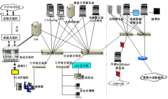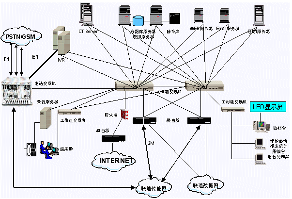 用戶撥打聯(lián)通客戶服務(wù)系統(tǒng)特服號(hào)碼1001,呼叫經(jīng)過電話網(wǎng)絡(luò)匯接到省中心匯接局,然后接入本系統(tǒng)。本系統(tǒng)的呼叫匯接采用《中國聯(lián)通客戶服務(wù)系統(tǒng)技術(shù)規(guī)范書》規(guī)定的匯接方式。