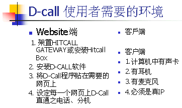 D-CALL指的是”Direct Call on Web”,提供電子商務中客戶與企業(yè)間網(wǎng)上實現(xiàn)網(wǎng)上實時語音互動平臺。