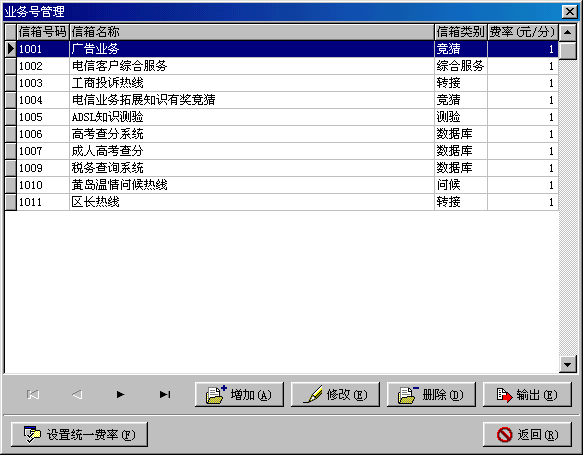 。。智能業(yè)務(wù)管理系統(tǒng)是Utron-CC2000進(jìn)行業(yè)務(wù)擴(kuò)充的主要手段。用戶如需擴(kuò)展新的業(yè)務(wù),主要通過(guò)智能業(yè)務(wù)管理系統(tǒng)向Utron-CC2000注冊(cè)該業(yè)務(wù);并為系統(tǒng)中的座席分配業(yè)務(wù)。根據(jù)實(shí)際業(yè)務(wù)的需求,生成相應(yīng)的系統(tǒng)信箱、業(yè)務(wù)腳本、服務(wù)項(xiàng)目等,來(lái)實(shí)現(xiàn)新業(yè)務(wù)的動(dòng)態(tài)加載。