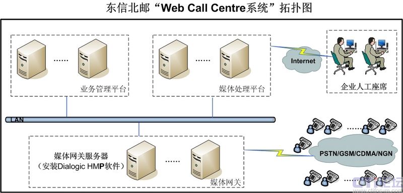 隨著中國經(jīng)濟的快速發(fā)展,越來越多的企業(yè)尤其是中小企業(yè)對呼叫中心的需求量越來越大,需求質(zhì)量也越來越高。由于呼叫中心建設涉及技術(shù)十分專業(yè)、涉及領(lǐng)域也比較廣泛、必須投入巨大的資金購買軟硬件設備,并且需要大量的維護力量,因此對于中小企業(yè),尤其是缺乏專業(yè)技術(shù)力量和資金的中小企業(yè)來說,建設自有的呼叫中心顯得不切實際。正是基于這種情況,EB開始與Dialogic合作,采用其HMP系統(tǒng)軟件,以IP技術(shù)為基礎,依托電信網(wǎng)絡,建設呼叫中心系統(tǒng),以托管方式為客戶提供呼叫中心服務,即Web Call Centre服務。