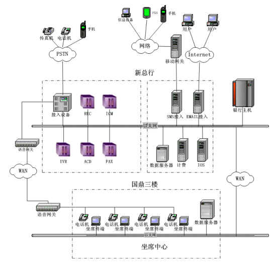溫州商業(yè)銀行Call Center 項(xiàng)目采用基于Dialogic語音卡的板卡方案,由于坐席分布在兩個(gè)不同地方(新總行和國(guó)鼎),因此,采用了Intel