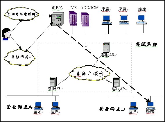 在總部設(shè)立集中的客戶服務(wù)中心完成對(duì)全網(wǎng)的人工座席的管理和調(diào)度,由總部的ACD完成對(duì)全網(wǎng)人工業(yè)務(wù)的呼叫分配,借助廣域網(wǎng)絡(luò),實(shí)現(xiàn)話務(wù)在區(qū)域范圍內(nèi)的接續(xù)。在座席配置上既可以采用集中配置,各營(yíng)業(yè)部分散配置專(zhuān)家座席的方式。