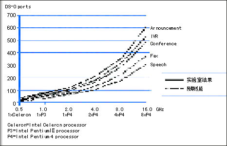 圖1顯示了主要的通信媒體處理功能的實(shí)驗(yàn)測(cè)量結(jié)果和預(yù)期性能。Intel 編制的HMP軟件,在Intel的從566 MHz 到 2 GHz的Celeron和 Pentium 處理器上,已經(jīng)對(duì)語(yǔ)音宣告、IVR和會(huì)議算法完成了實(shí)現(xiàn)、優(yōu)化和測(cè)試。圖1中的實(shí)線表示實(shí)驗(yàn)室中的測(cè)試結(jié)果。Intel的目標(biāo)是實(shí)現(xiàn)這些算法,并擴(kuò)展到更高速的Intel Pentium處理器,雙路、四路、甚至八路Intel Pentium處理器、Intel Xeon處理器以及Intel Itanium處理器。圖1中的虛線顯示了Intel所期望的在未來(lái)的實(shí)現(xiàn)中將得到的結(jié)果。目前,HMP的版本主要以Windows為主,很快就會(huì)推出Linux版本。從根本上說(shuō),HMP最適合用在純IP的環(huán)境,也可通過(guò)擴(kuò)展到多個(gè)服務(wù)器實(shí)現(xiàn)密度的提升。