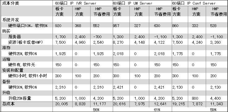 在眾多好處當(dāng)中,對(duì)用戶最有吸引力的無(wú)疑是節(jié)省成本。張怡國(guó)特別強(qiáng)調(diào),對(duì)一個(gè)應(yīng)用系統(tǒng)而言,成本的計(jì)算不應(yīng)該單以產(chǎn)品端口購(gòu)買價(jià)格考核,而應(yīng)該是系統(tǒng)總的建設(shè)成本,包括產(chǎn)品購(gòu)買成本、服務(wù)器成本、運(yùn)輸、安裝、庫(kù)存、升級(jí)等多項(xiàng)費(fèi)用;贖MP1.1版本,張怡國(guó)作了一個(gè)比較,以60端口IP IVR 60、端口IP UM或者60路會(huì)議為例,和語(yǔ)音板卡處理方式相比,基于HMP軟件實(shí)現(xiàn)能有近60%的成本節(jié)省,其中采購(gòu)能節(jié)省20%,庫(kù)存節(jié)省20%,備份節(jié)省20%,升級(jí)節(jié)省近40%。