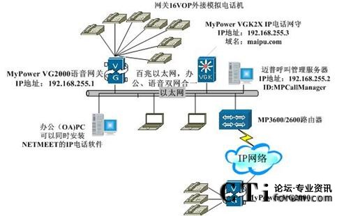 在這種應(yīng)用中,用戶通過IP網(wǎng)絡(luò)接入以太網(wǎng)IP電話機(jī)的同時(shí),還可以在MyPower VG2000 IP語音網(wǎng)關(guān)上插入兩張16VOP IP電話模塊,接32個(gè)普通電話機(jī)。這32個(gè)電話機(jī)就像其它以太網(wǎng)IP電話機(jī)一樣可以和其它IP網(wǎng)上的IP電話機(jī)互相呼叫,此時(shí),我們把MyPower VG2000 IP語音網(wǎng)關(guān)作為一個(gè)小型的PBX接入平臺。