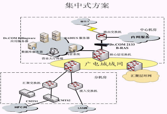 根據(jù)廣電城域網(wǎng)目前網(wǎng)絡(luò)的規(guī)模,以及以后的擴(kuò)展,采用集中接入認(rèn)證與計(jì)費(fèi),統(tǒng)一管理的方案,集中接入指:接入服務(wù)器部署在各個(gè)匯聚層的匯聚點(diǎn),即在網(wǎng)絡(luò)出口安裝寬帶接入服務(wù)器,由寬帶接入服務(wù)器對所有用戶進(jìn)行身份認(rèn)證、接入控制、實(shí)時(shí)計(jì)費(fèi)、數(shù)據(jù)采集,并將賬單和訪問日志等傳送至綜合業(yè)務(wù)系統(tǒng)。統(tǒng)一管理指在中心機(jī)房就可以進(jìn)行全部的管理,包括:網(wǎng)絡(luò)設(shè)備管理;用戶管理;經(jīng)營策略管理;賬務(wù)管理;安全管理;數(shù)據(jù)分析。提供完整的用戶資料分析,使用習(xí)慣分析,運(yùn)營統(tǒng)計(jì)等詳細(xì)分析報(bào)表。
